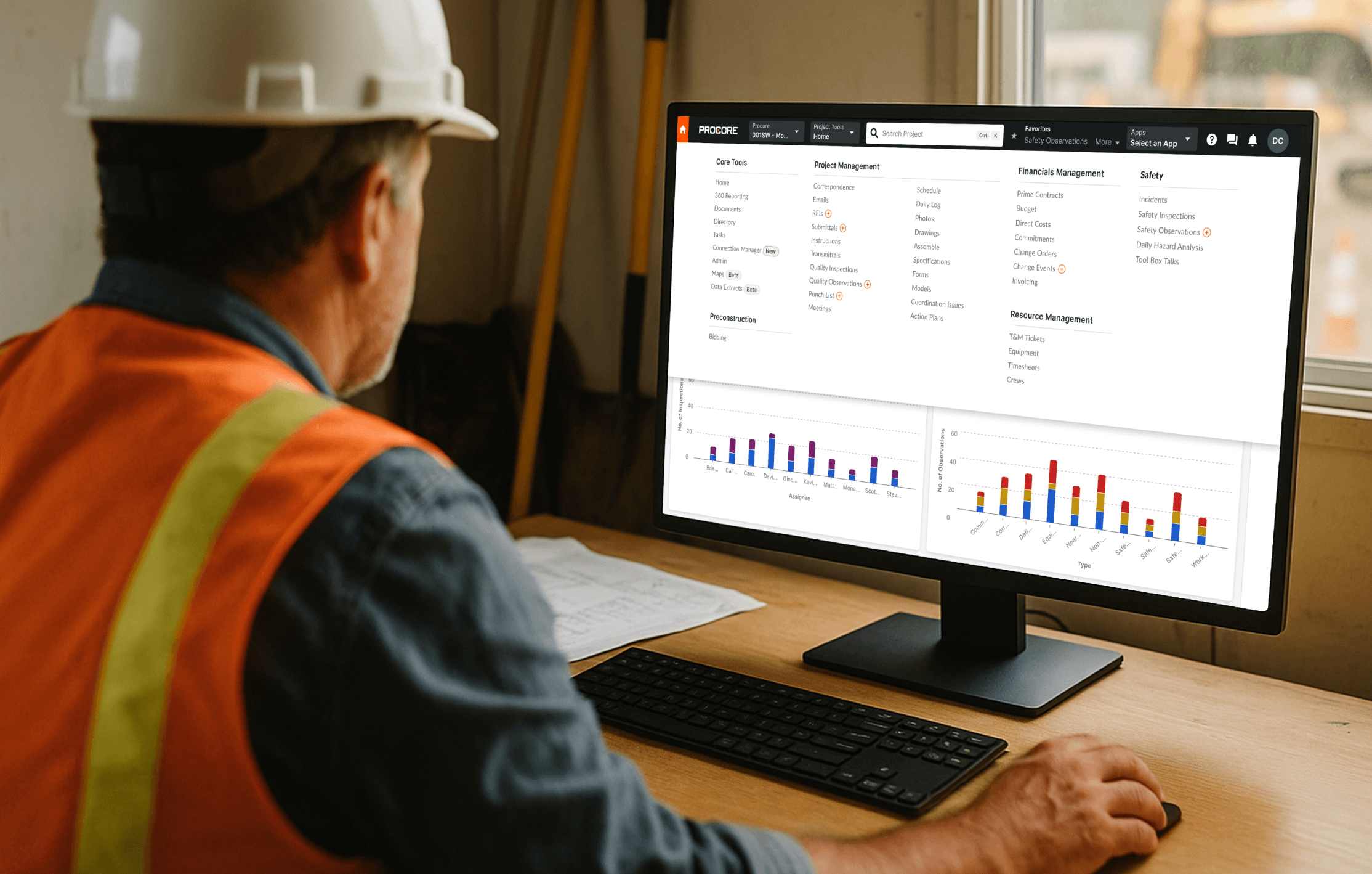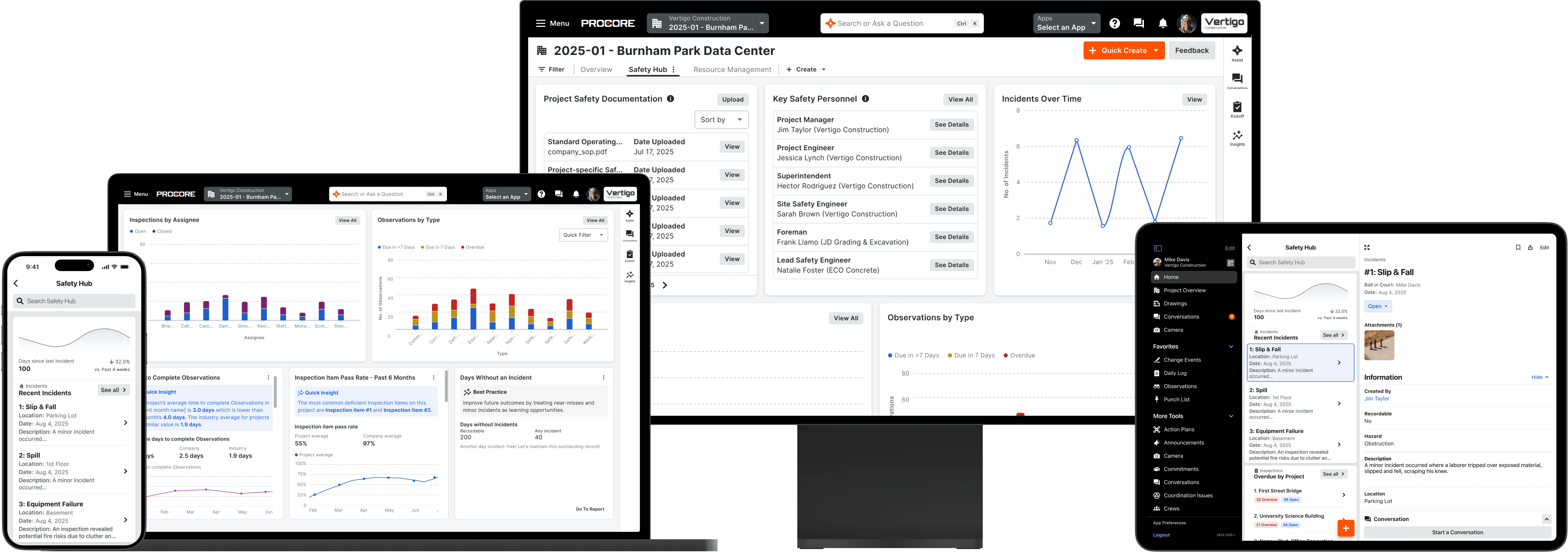 A centralized safety dashboard — the first of its kind in Procore — giving safety leaders a single view into company and project-level safety data. Incidents over time, observations by type, inspection results, safety personnel metrics, with drill-down from high-level trends to specific records.